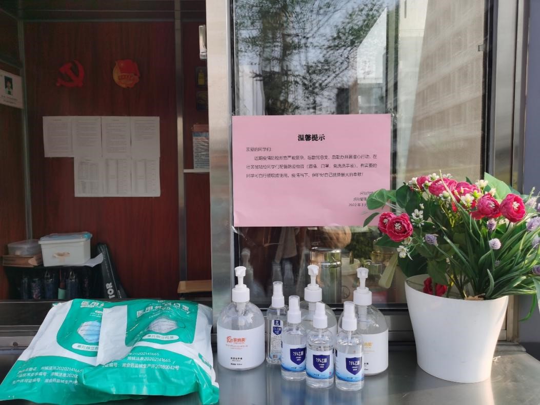 313日、15日下午,后勤党员同志充分发挥先锋模范作用,在每个社区微站配备防疫物资供学生自行领取或者使用,共配备免洗洗手液5瓶、消毒液15瓶、口罩2300个。提醒未佩戴口罩的同学注意做好个人防护,规范佩戴口罩,为抗击新冠肺炎疫情承担自己的义务与责任。